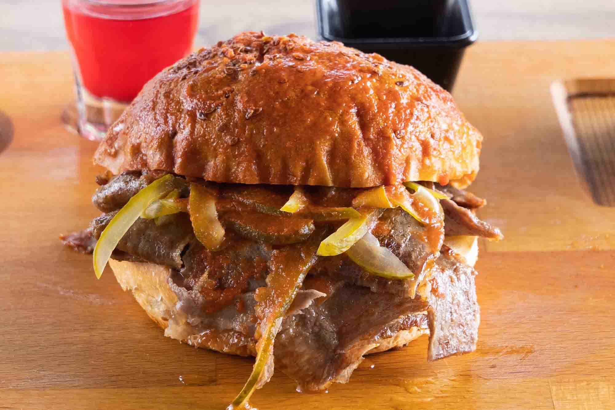 Hand trimmed Corned beef, Melted Swiss cheese, sauerkraut and Russian dressing on grilled rye.